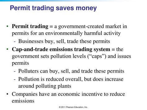 Permit trading, also known as emissions trading or cap and trade, is a system that puts a price on pollution. It works by setting an overall limit on the amount of pollution that can be emitted, and then allocating permits to companies that allow them to emit a certain amount of pollution. These permits can be bought, sold, or traded in a marketplace, creating a market for pollution.